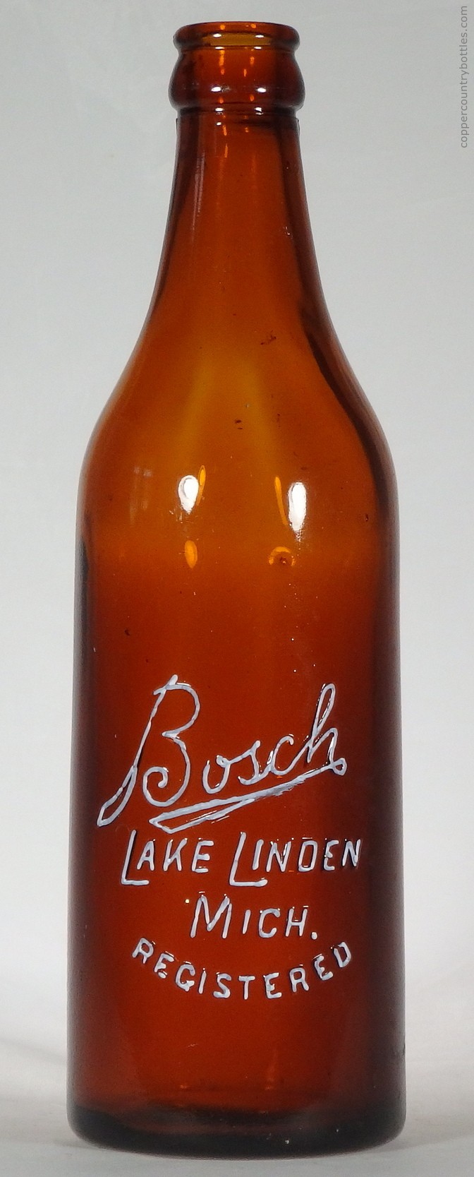 George Wertin died in 1890 (7). After Joseph Wertin Sr. died in 1893 (1), Bosch purchased his interest and that of Joseph Wertin Jr. (2). On 01 Mar 1894, Bosch formed a stock company, the Bosch Brewing Co., for which he maintained controlling interest and served as president (1,2,5,26). The bottles reflected this transition with the embossing changed to BOSCH BREWING CO. / LAKE LINDEN, MICH. from about 1895.