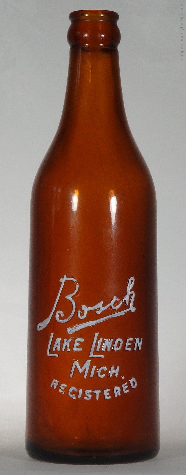 The company stated that bottling was the most substantial aspect that extended its reach (1). Superior Stock and Ulmer were sold in kegs and bottles, while Export was only sold in bottles (1). In Jun 1893, the company announced that Superior Stock could now be purchased in pint bottles, with a 24-bottle case selling for $1.25 (25). By 1899, the company bottled 1,063,452 bottles and thousands of kegs of its number one beer, Superior Stock (1). The company had branches and storehouses in Hancock, Calumet, Ishpeming, Eagle Harbor, and Baraga (1). In Dec 1896, the newspaper described "a new device", the crown cap, which Bosch was using to seal the bottles of Superior Stock (65). In the late 1890s, the embossing on the bottles changed to the script Bosch design. In 1902, annual production was about 20,000 barrels (10).