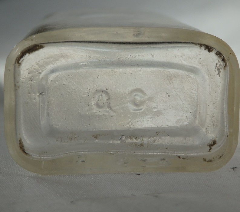Lockhart et al. (27) cited conflicting reports of when Dean, Foster & Co. started but concluded that it was most likely in 1874. Started by George Foster, Charles L. Dean, and Albert G. Smalley, the company was a glassware wholesaler not a glass maker (27). Lockhart et al. (27) lists the companies that supplied Dean, Foster & Co. (and also A. M. Foster & Co.), but noted that the pharmacy bottles bearing their marks appear to have been produced by the glass factories under their control: Marion Flint Glass Co. in Marion, IL and Sheldon-Foster Glass Co. in Gas City, IN and Chicago, IL. Lockhart et al. (27) reasoned the company likely closed in c.1911 when Foster bought the Upland Flint Bottle Co.