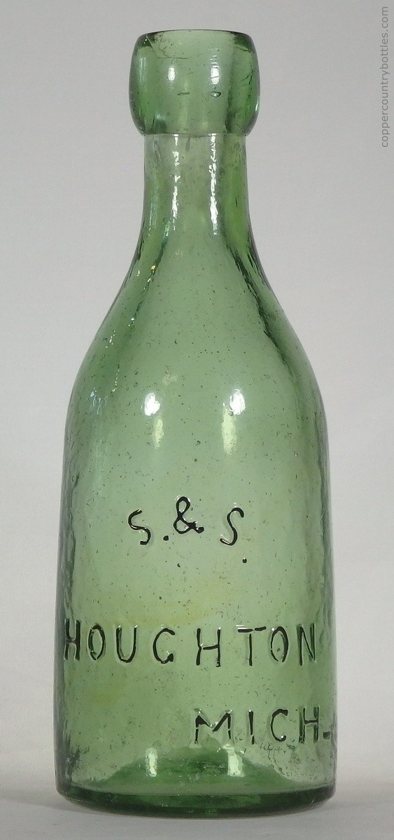 With only a pair of initials, the S. & S. bottle provides little information about its bottling works and proprietors. Based on the bottle being a squat soda with the A & D H C maker's mark, we focused our search to the 1860s - 1870s. We do not have access to the 1865 and 1869 volumes of the Michigan State directory, so it was fortunate that the 1867 volume had a listing for "Shelden & Sheffer" (1). Curiously, it listed them in Houghton as druggist and in Hancock under Soda and Mineral Water Manufacturers. The listing, however, did not provide first names or a business address.